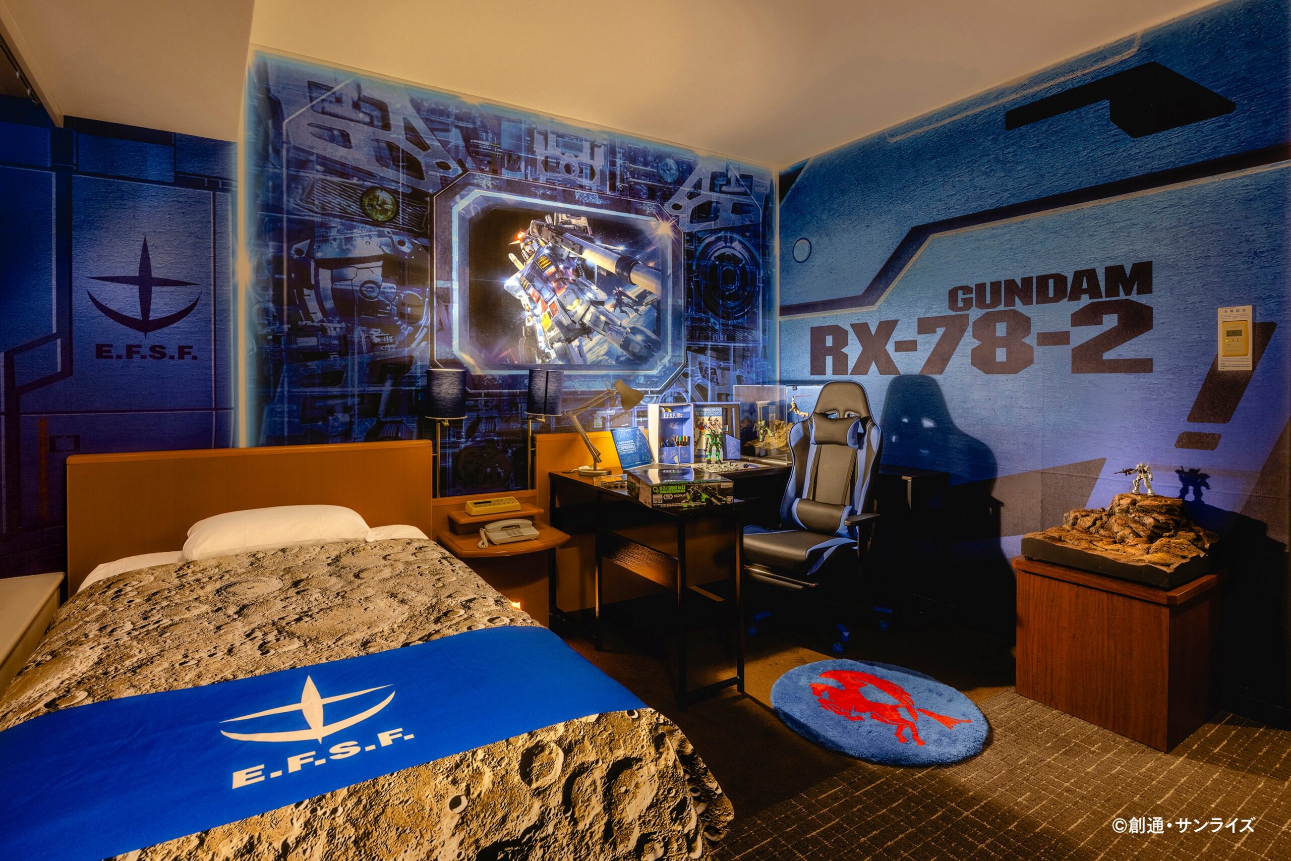 Già dalla porta d’ingresso, con le sue linee futuristiche, la stanza comunica la propria vocazione per l’universo di Gundam. L’interno è dominato da tonalità blu, con stemmi della Earth Federation Space Force che decorano le pareti e i tessuti. Il punto visivo più spettacolare è il murale dell’RX-78-2, progettato per sembrare un finestrone con vista sullo spazio. Di notte, con le luci soffuse, l’effetto è quello di trovarsi a bordo di una nave stellare, immersi in un’atmosfera che mescola suggestione fantascientifica e spirito collezionistico. Persino i letti contribuiscono a rafforzare l’immersione, grazie a lenzuola stampate con crateri lunari che diventano scenografie ideali per fotografie creative con i modellini.