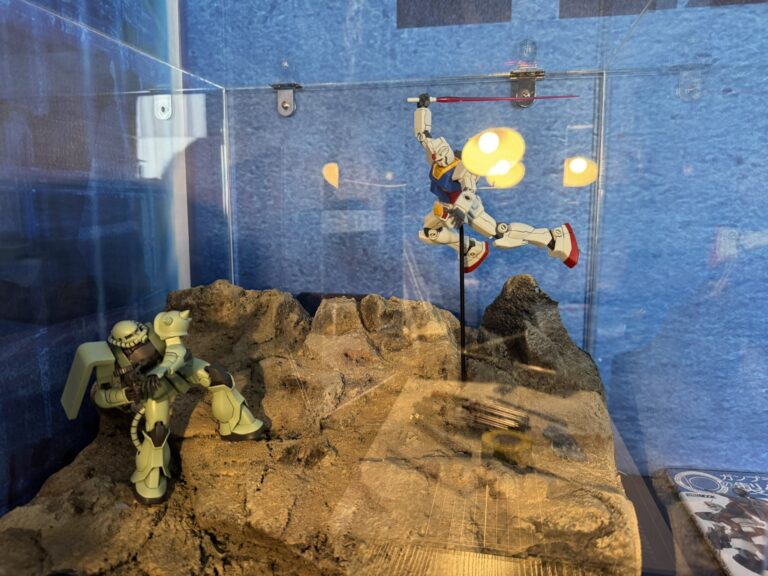 L’iniziativa non si limita al montaggio: la stanza ospita anche una piccola area diorama dove posizionare e fotografare le proprie creazioni. Inoltre, gli scarti delle griglie di montaggio possono essere depositati nella hall, presso un contenitore del Gunpla Recycling Project, contribuendo così a un ciclo di produzione ecosostenibile.