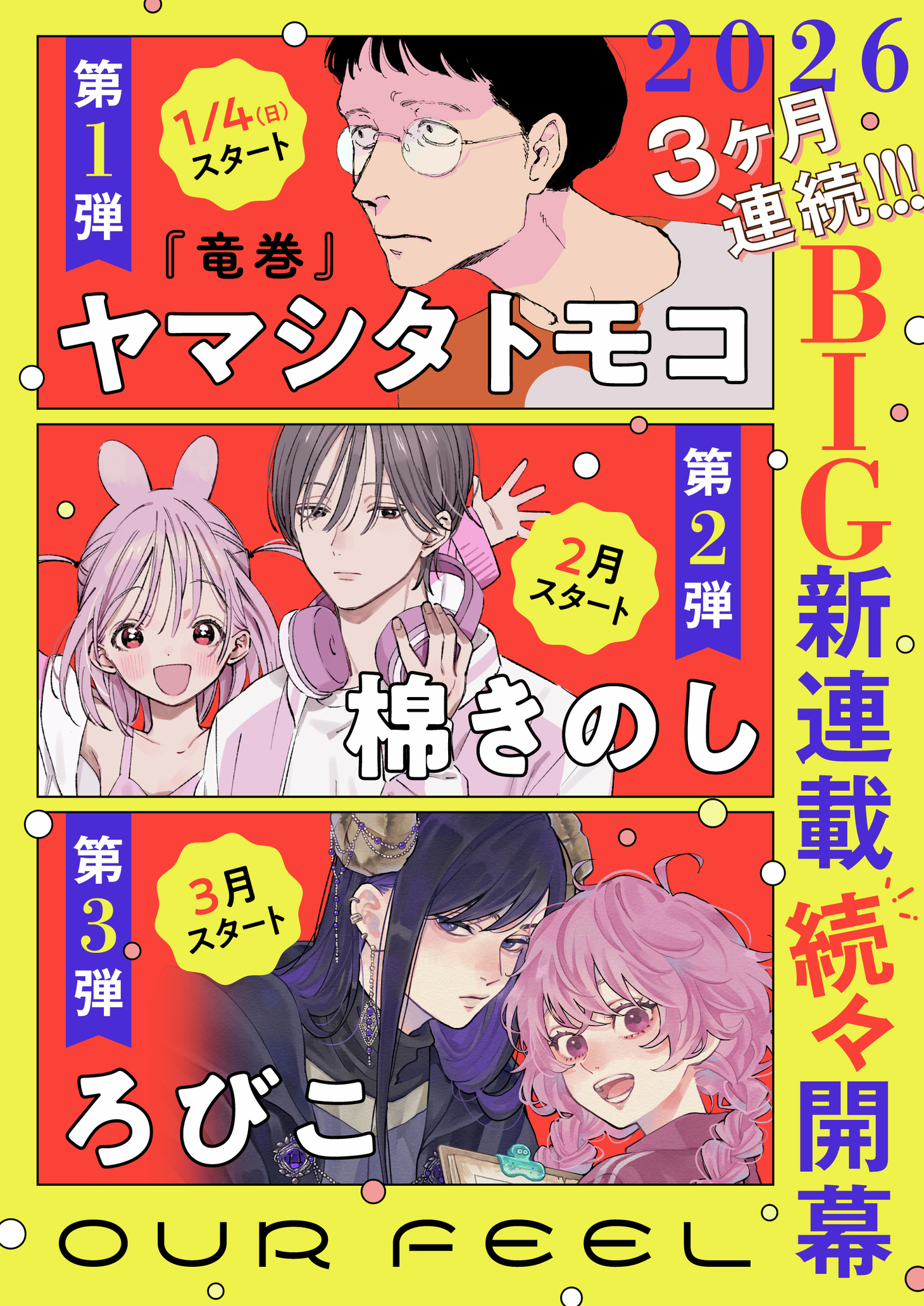 Accanto a Tatsumaki, Our Feel ospiterà anche una nuova opera di Robico, in arrivo nel mese di marzo. L’autrice è conosciuta soprattutto per My Little Monster, manga serializzato tra il 2008 e il 2013 e diventato un punto di riferimento dello shōjo moderno, grazie al suo equilibrio tra romanticismo, ironia e personaggi fuori dagli schemi.