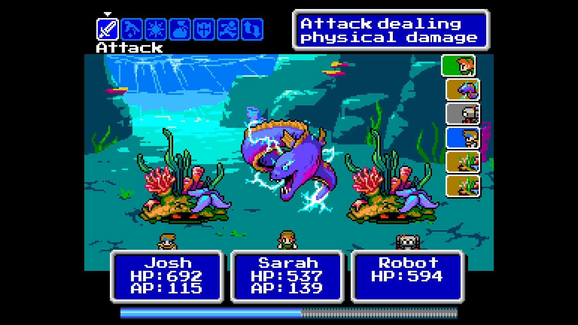 Il gameplay di 8-Bit Adventures 2 si radica profondamente nelle meccaniche tradizionali dei JRPG, ma non si limita a replicarle: le espande e le perfeziona per offrire un’esperienza tanto familiare quanto innovativa. Il sistema di combattimento a turni è, senza dubbio, il cuore pulsante del gioco. Sebbene possa sembrare inizialmente simile a quello di classici come Final Fantasy IV o Chrono Trigger, il titolo introduce una serie di accorgimenti che lo distinguono. Una delle caratteristiche più apprezzabili è la libertà di gestire il party durante le battaglie: i giocatori possono scambiare i membri attivi con quelli in riserva senza penalità, ampliando le possibilità strategiche. Questo sistema favorisce un utilizzo dinamico del roster, che include sette eroi dalle abilità uniche, come un maestro di arti marziali cieco o un robot con inclinazioni distruttive, ciascuno con un ruolo ben definito.
